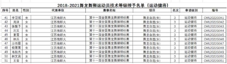 根據中國龍獅運動協會運動員技術等級管理辦法有關規定,此次評選經申報、審核、公示等環節,全國共有28人獲得“國際級運動健將”稱號、375人獲得“運動健將”稱號、388人獲得“一級運動員”稱號。