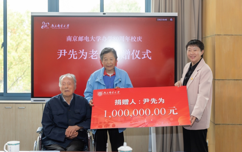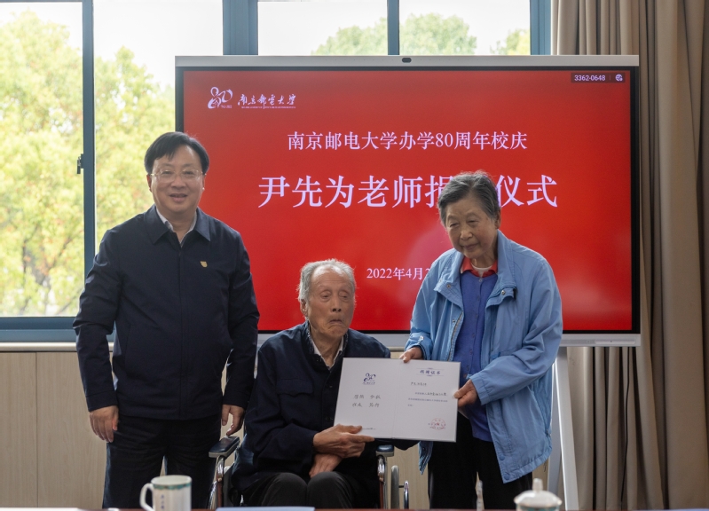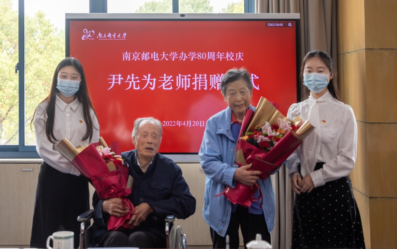我校94歲高齡的離休教師尹先為一生節儉,卻堅持要將省吃儉用攢下的畢生積蓄100萬元全部捐贈給學校。4月20日,是南京郵電大學辦學80周年的校慶日,一場特殊的捐贈儀式在仙林校區第一會議室舉行。尹先為及其夫人白金漢,校黨委書記劉陳,校長葉美蘭,校黨委常委、副校長、教育發展基金會理事長張志華,校黨委常委、副校長王友國出席儀式。儀式由張志華副校長主持。
