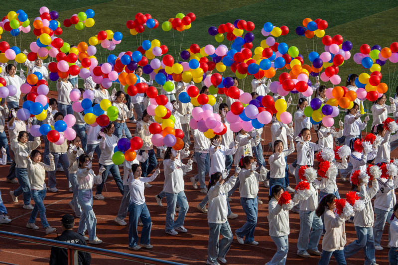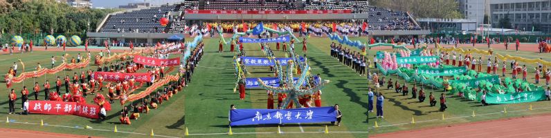 開幕式表演環節,來自學校27個基層工會的400名教職工表演了《第九套廣播體操》,展現了南郵教師積極、健康、向上的精神風貌。由經濟學院和體育部共同編排的創意龍獅表演《輝煌八秩——紅綠藍》共“紅——烽火戰郵、綠——江南建校、藍——奮進一流、再鑄輝煌——邁進新時代”四個篇章,展現學校八十一年邁向新時代的輝煌歷史,全體師生,萬眾一心,錨定一流,踔厲奮發。鏗鏘有力、熱鬧非凡的鑼鼓聲中一條條長龍在操場上翻騰起舞,一只只獅子威武雄壯,在操場上踢跳翻蹬、立臥滾抖、勇猛憨厚、驚險逗趣,帶動了賽場的歡騰氛圍。開幕式最后,團體操表演帶來了《輝煌中國夢》《紅色基因·追夢奮進》《新時代· 新征程》三部曲。時代青年蓬勃、熱情的鮮活之風盡顯,南郵學子昂揚、奮發的青春熱血盡現。