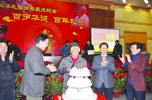 昨天,南京郵電大學為首任老院長、老紅軍,百歲老人秦華禮舉辦百歲壽辰慶祝會。令來賓感嘆的是,雖然一百歲高齡,秦老臉上卻沒有太多皺紋,而且腰背挺直、精神矍鑠、步履堅定,滿頭銀發紋絲不亂。熟悉他的人都說,秦老熱愛生活,90多歲還帶領南郵的老年門球隊滿中國“飛”,參加比賽。每天讀《揚子晚報》也是他多年的習慣之一。