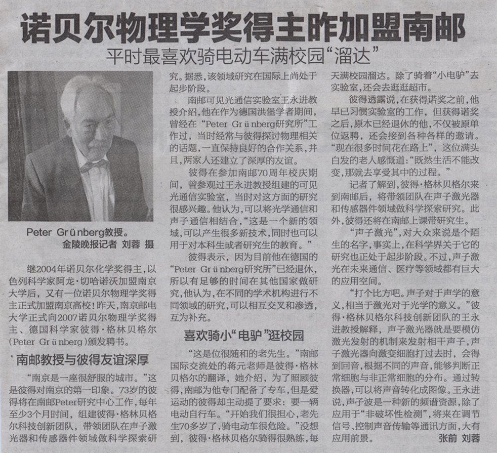 【金陵晚報】諾貝爾物理學獎得主昨加盟南郵
