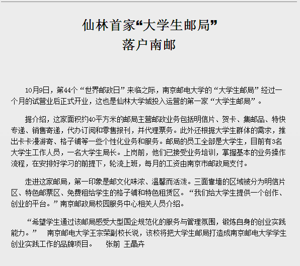 【南京晨報】南京首家“大學生郵局”落戶南郵