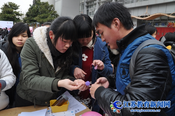3月7日是女生節(jié),南京郵電大學(xué)的女生們?cè)趯W(xué)校的南二廣場用自己的巧手做成串珠、鑰匙扣等一件件小飾品送給過往的同學(xué)和老師。在這么一個(gè)富有女人味的現(xiàn)場,記者驚奇地發(fā)現(xiàn)不少男生的身影。男女搭配,精心編織,美麗的飾品躍然入目。男生的做派,看著似乎不那么“大男人”,卻讓女生別有一份溫情上心頭。