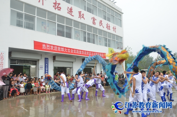 曾經(jīng)獲得全國(guó)龍獅精英賽冠軍的大學(xué)生舞龍隊(duì),在民主村黨支部、村委會(huì)門外廣場(chǎng)為村民們送上了一場(chǎng)精彩的舞龍表演。音樂聲中兩條長(zhǎng)龍翩翩起舞,或騰躍、或滾動(dòng)、或盤起、或穿插,歡快的音樂、專業(yè)的表演、宏大的場(chǎng)面,贏得村民們的熱烈掌聲。“以前這樣的專業(yè)表演我們只在電視上看過,今天能看到真人的表演真是很開心。”一位村民這樣說。