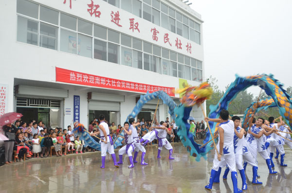 曾經(jīng)獲得全國龍獅精英賽冠軍的大學(xué)生舞龍隊,在民主村黨支部、村委會門外廣場為村民們送上了一場精彩的舞龍表演。音樂聲中兩條長龍翩翩起舞,或騰躍、或滾動、或盤起、或穿插,歡快的音樂、專業(yè)的表演、宏大的場面,贏得村民們的熱烈掌聲。“以前這樣的專業(yè)表演我們只在電視上看過,今天能看到真人的表演真是很開心。”一位村民這樣說。