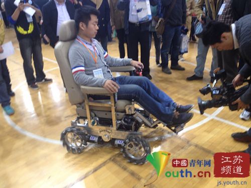 優(yōu)秀成果展示之一:麥克納姆輪多功能輪椅。中國青年網(wǎng)記者 孔維鵬 攝