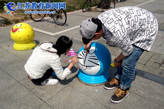 (通訊員 張前)大白、機器貓、皮卡丘、龍貓……,這些可愛的卡通形象出現在了南京郵電大學的校園內。4月11日中午開始,傳媒與藝術學院的二十多位同學手持畫筆,把校園里的路障球裝扮得萌萌噠。該院學生會主席朱林同學介紹說:“一個路障球需要花上4個小時才能裝扮好。同學們積極性很高,從上午九點就開始畫了。”他接著又說到:“我們前期集思廣益,向全校征集好點子。最終決定在圖書館、教學樓、南大門三個區域的70多個路障球上,分學校形象、青春、運動、安全等主題,通過涂鴉卡通形象、各種球類以及學校元素,為校園春色增添了一道亮麗的風景。