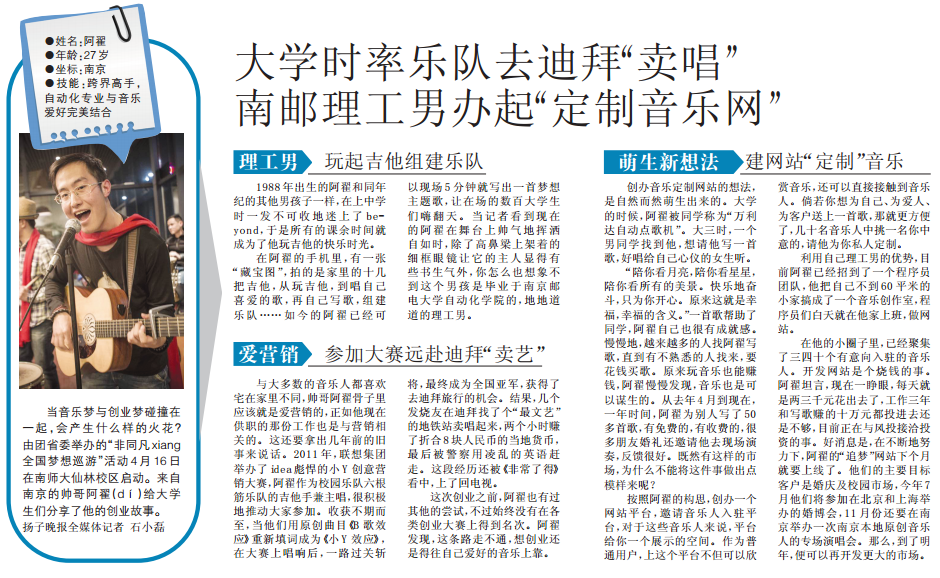 【揚子晚報】大學時率樂隊去迪拜“賣唱” 南郵理工男辦起“定制音樂網”