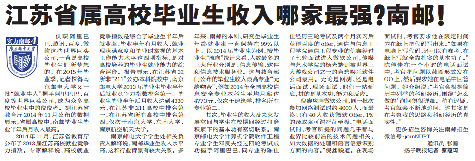 【揚子晚報】江蘇省屬高校畢業生收入哪家最強?南郵!