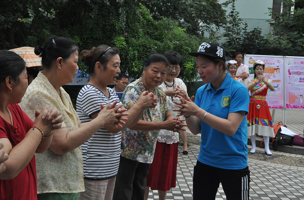 志愿者在秦淮區御道街藍旗社區教老人做手指操 中國青年網通訊員李心電提供