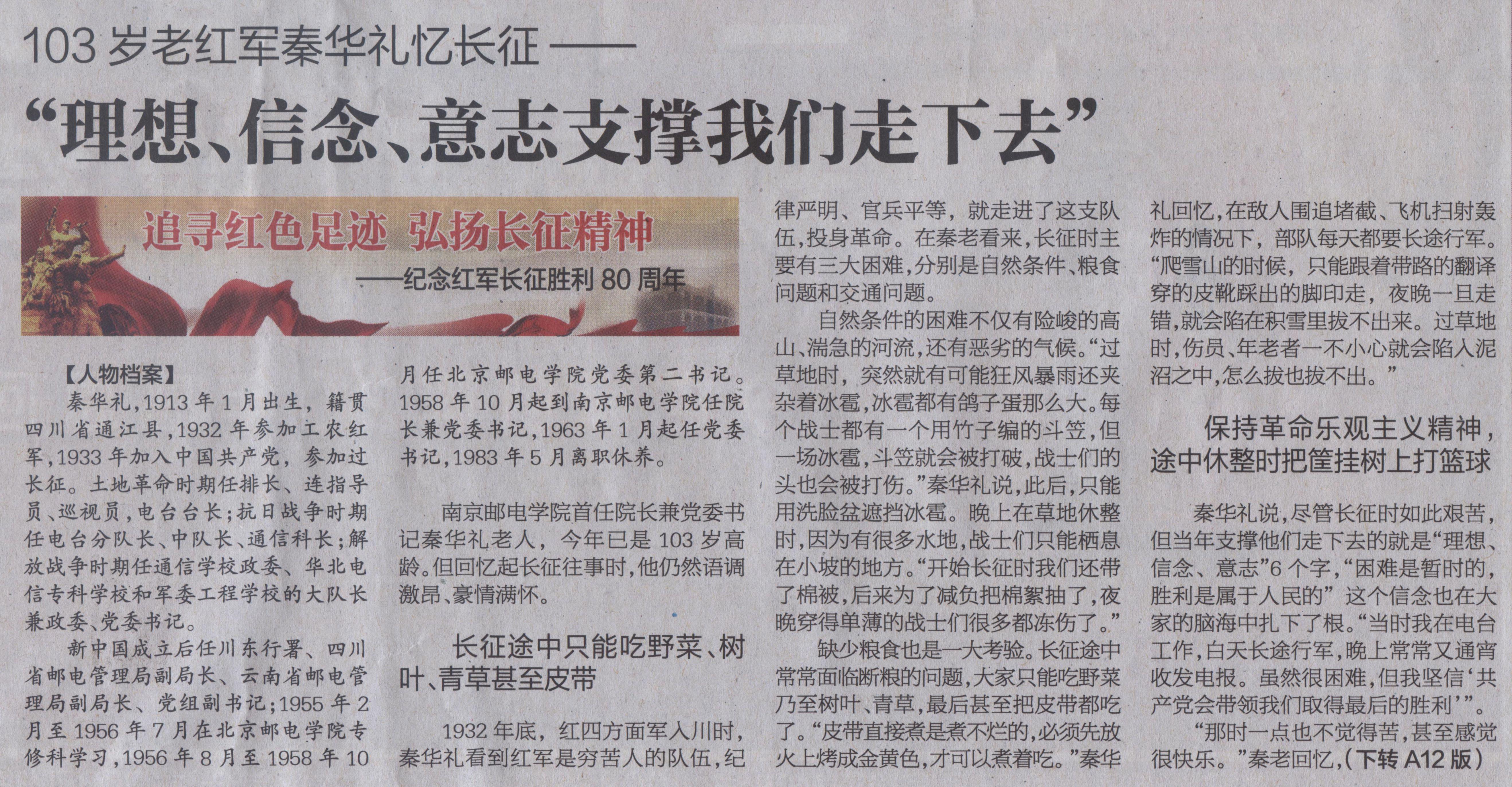 【南京日報】103歲老紅軍秦華禮憶長征——“理想、信念、意志支撐我們走下去”