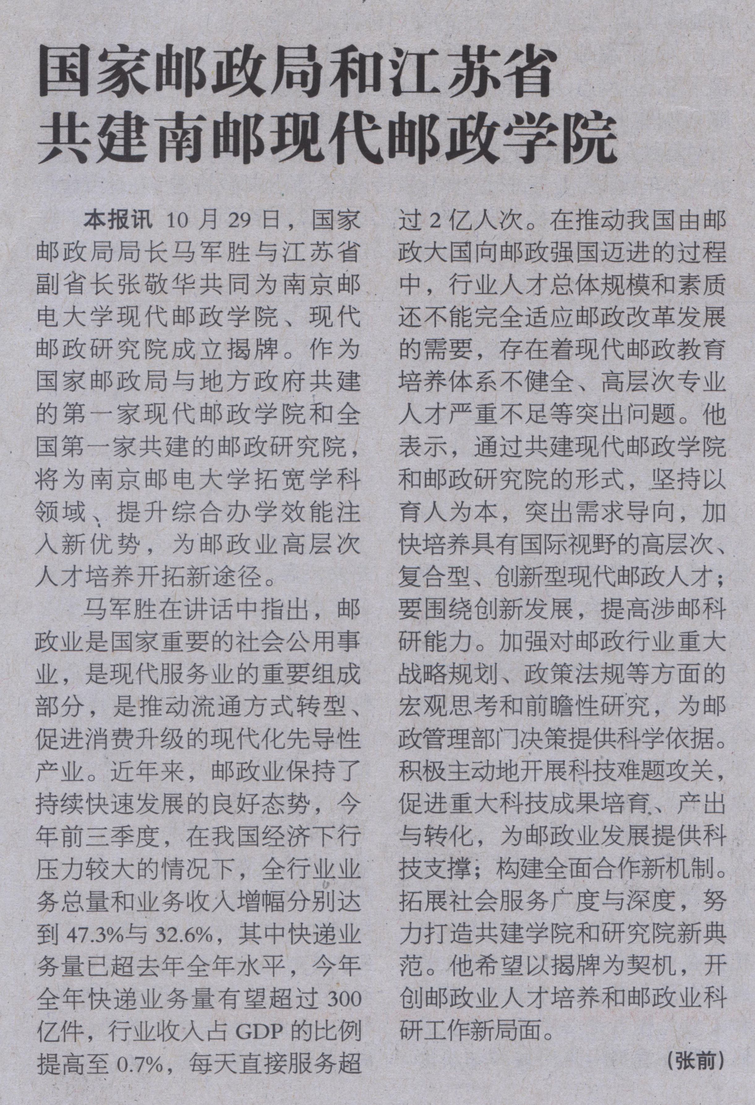 【人民郵電】國家郵政局和江蘇省共建南郵現(xiàn)代郵政學(xué)院