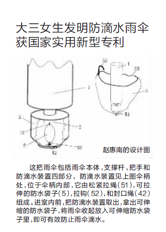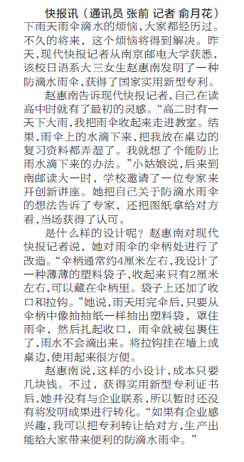 【現代快報】大三女生發明防滴水雨傘 獲國家實用新型專利