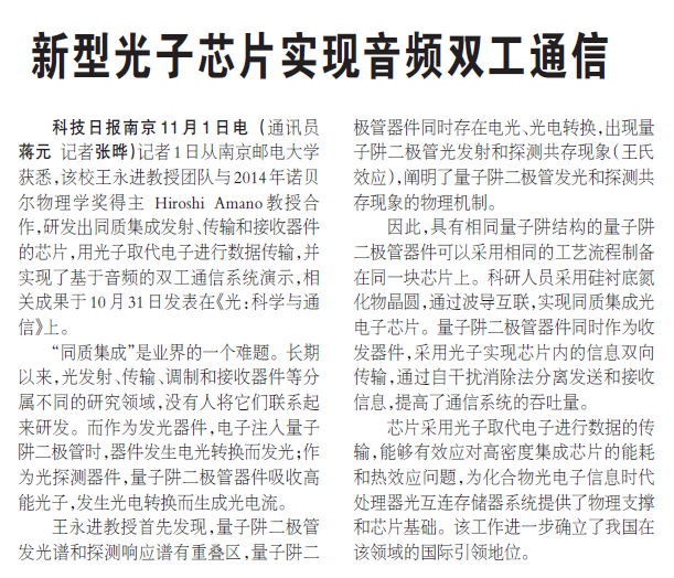 【科技日?qǐng)?bào)】新型光子芯片實(shí)現(xiàn)音頻雙工通信
