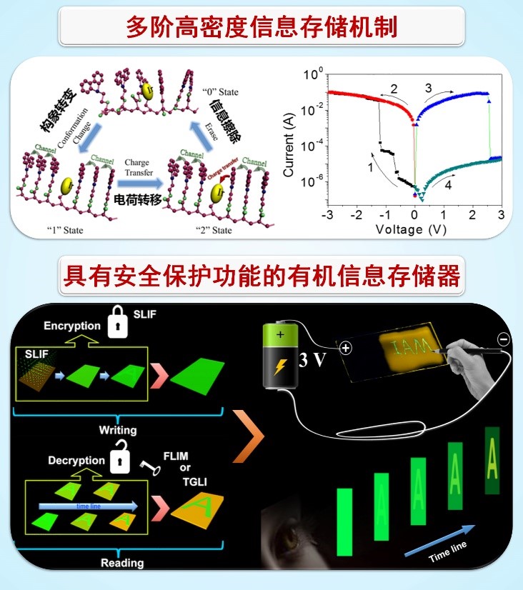 同時,團隊還致力于推動金屬有機半導體的多功能化,發(fā)展智能響應(yīng)型金屬有機半導體,并實現(xiàn)了高密度和高安全性信息存儲。項目第二完成人、南京郵電大學趙強教授介紹,現(xiàn)在大家使用的U盤,是無機半導體材料做的,存儲量和安全性都有待提高。項目組在十多年的研究中,發(fā)現(xiàn)有機半導體會在外界物理刺激下產(chǎn)生電學或光學信號的“智能響應(yīng)”行為,比如給它加個電場后,其分子材料的電學性質(zhì)和光學性質(zhì)會發(fā)生顯著變化。這種特性可以用于高密度和高安全性的信息存儲。項目組根據(jù)這種“智能響應(yīng)性”,提出了可印刷加工的二階和三階金屬聚合物信息存儲半導體的設(shè)計新策略,制備了高穩(wěn)定電存儲器,率先研制了基于單一聚合物的三階信息存儲器,為發(fā)展可印刷加工的超高密度信息存儲提供了有效途徑。在研究中,還發(fā)現(xiàn)電場誘導金屬有機半導體磷光變色現(xiàn)象,提出智能響應(yīng)型有機信息存儲的設(shè)計原理,同時利用磷光壽命長的特點,通過時間分辨光學成像,發(fā)展了具有安全保護功能的信息存儲技術(shù),開辟了有機信息存儲領(lǐng)域的研究新方向。
