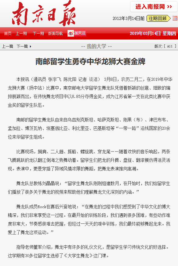 【南京日報】南郵留學生勇奪中華龍獅大賽金牌