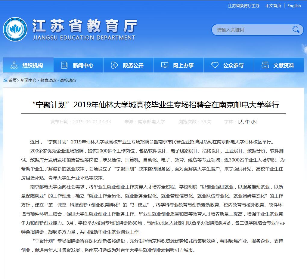 【江蘇教育】“寧聚計劃”2019年仙林大學(xué)城高校畢業(yè)生專場招聘會在南京郵電大學(xué)舉行