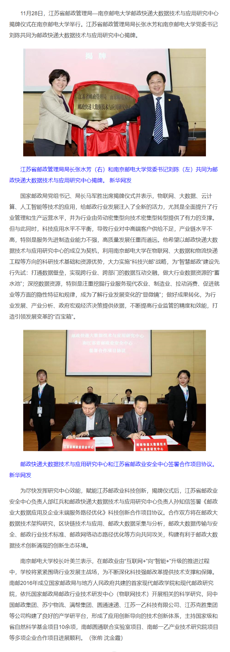 【新華網】江蘇省郵政管理局-南京郵電大學郵政快遞大數據技術與應用研究中心揭牌