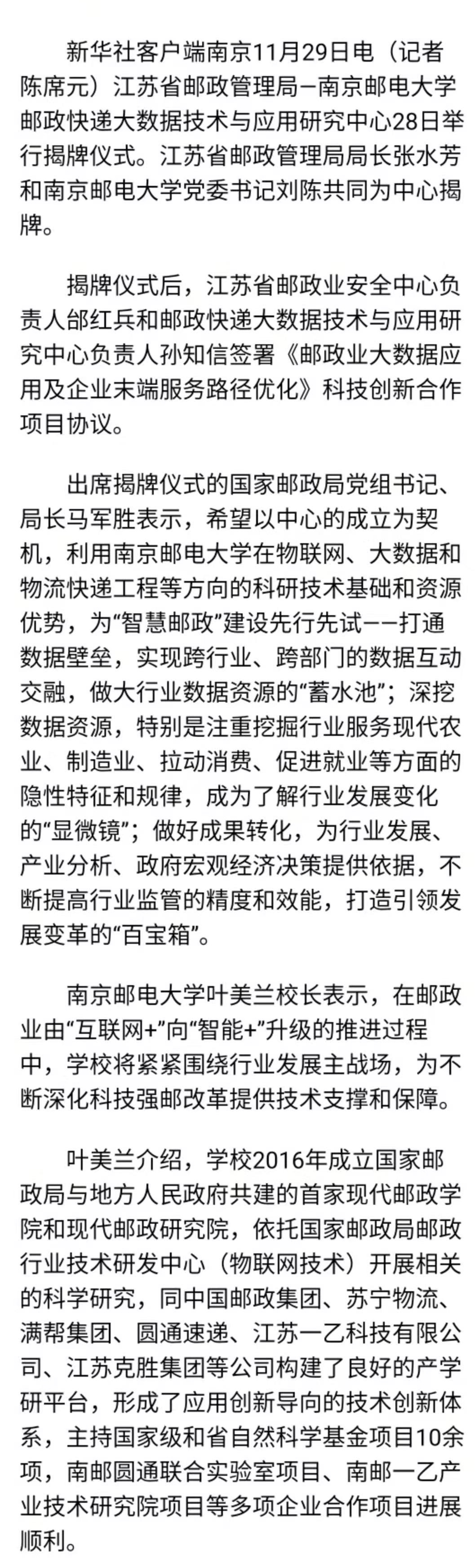 【新華社客戶端】南京郵電大學郵政快遞大數據技術與應用研究中心揭牌