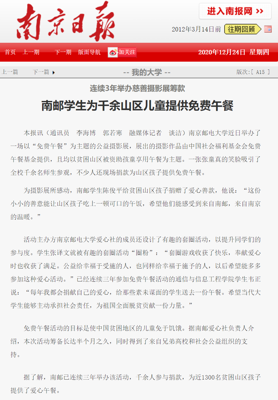 【南京日報】南郵學生為千余山區兒童提供免費午餐