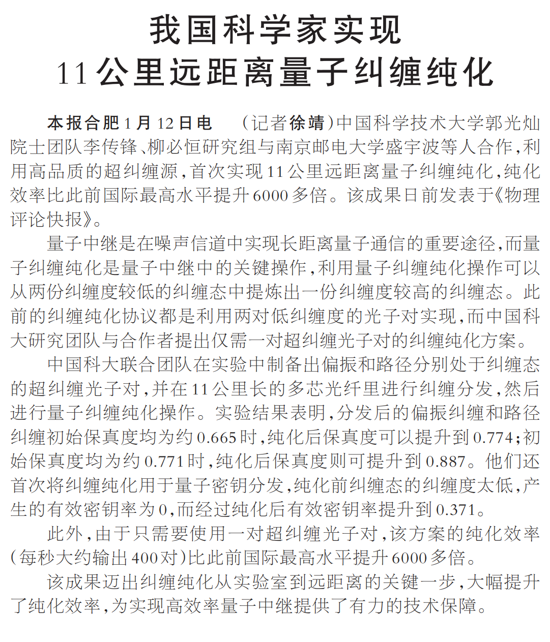 【人民日報】我國科學家實現11公里遠距離量子糾纏純化