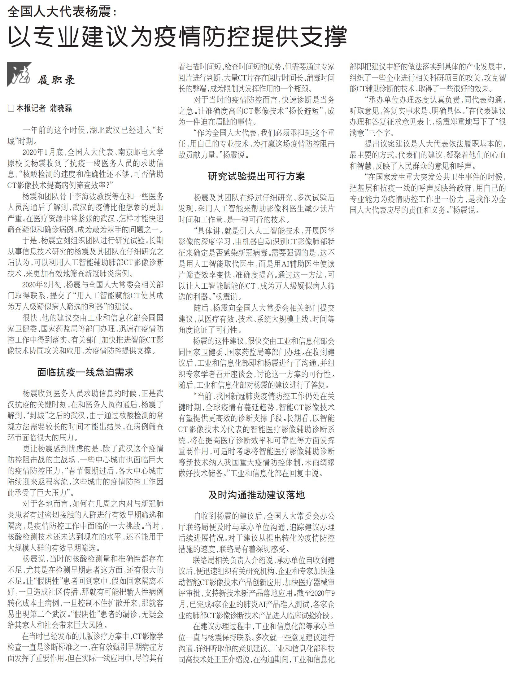 【法治日報】全國人大代表楊震:以專業建議為疫情防控提供支撐