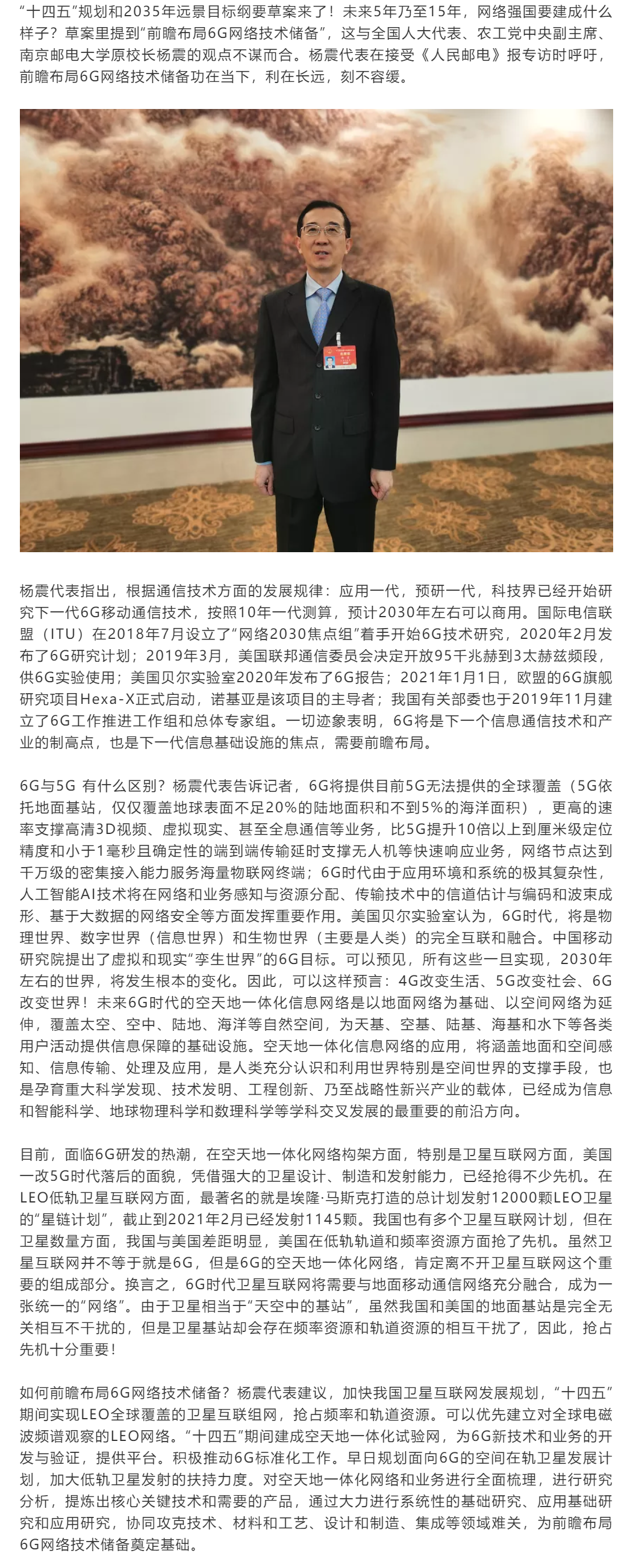 【人民郵電報】全國人大代表楊震: 前瞻布局6G網絡技術儲備刻不容緩