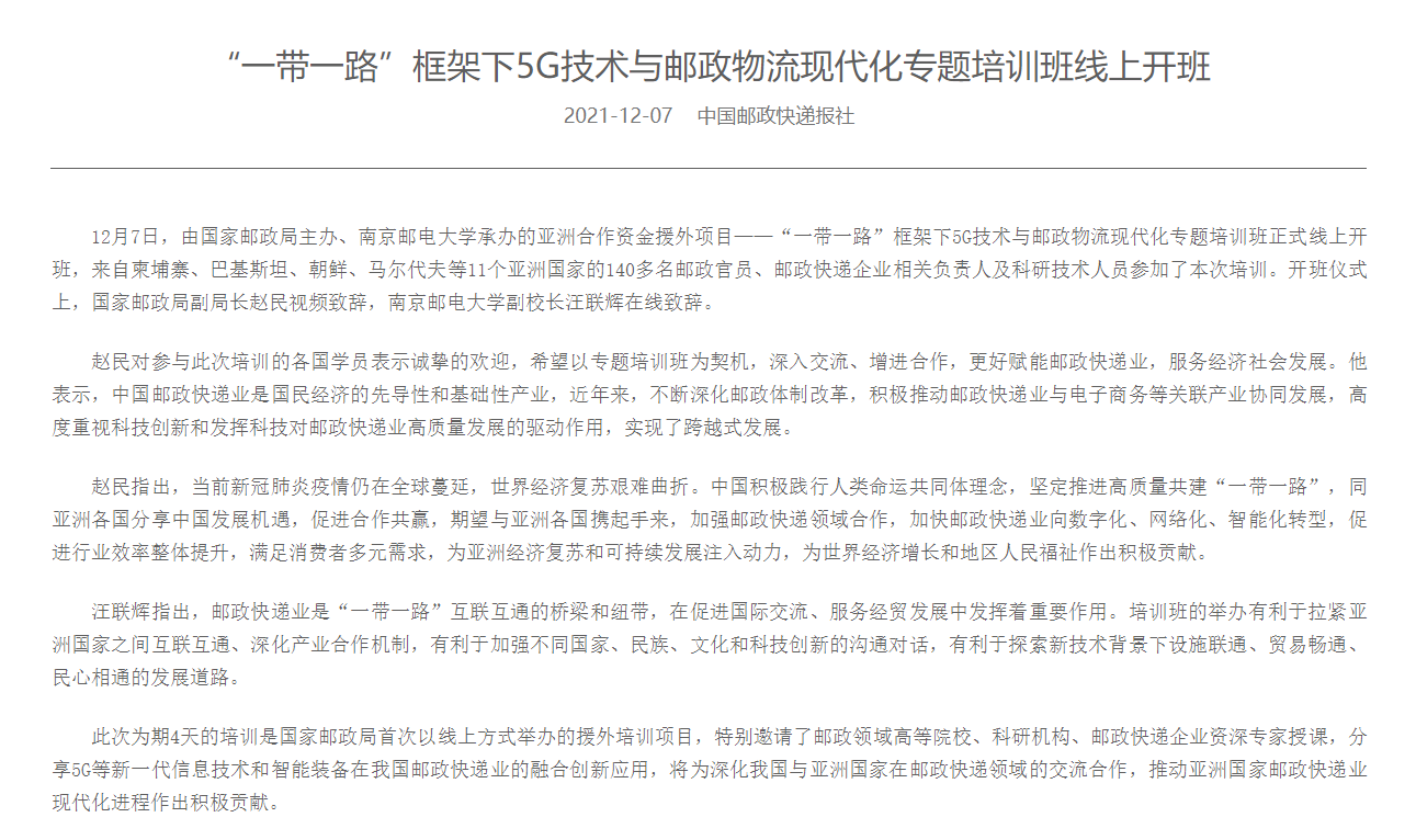 【中國郵政快遞報】“一帶一路”框架下5G技術與郵政物流現代化專題培訓班線上開班