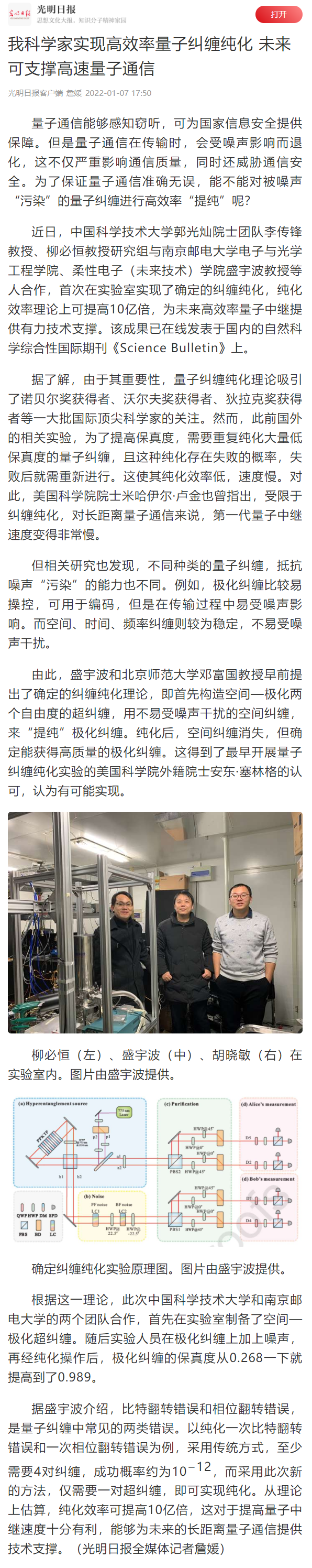 【光明日報客戶端】我科學家實現高效率量子糾纏純化 未來可支撐高速量子通信