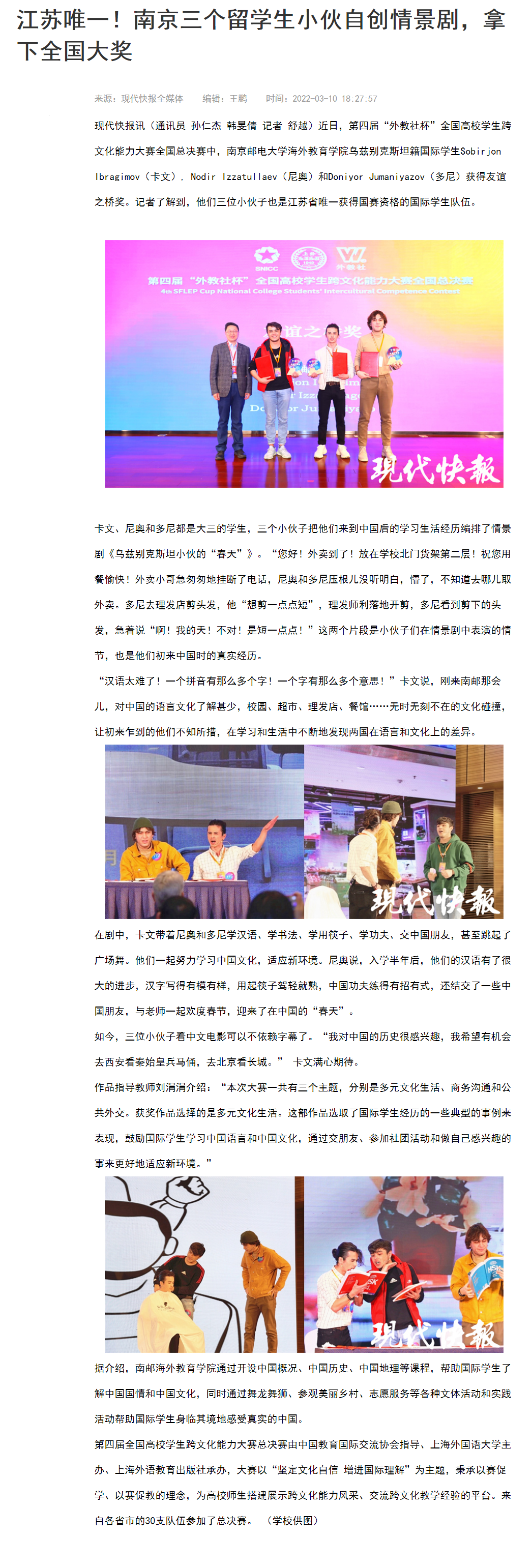 【現代快報全媒體】江蘇唯一!南京三個留學生小伙自創情景劇,拿下全國大獎