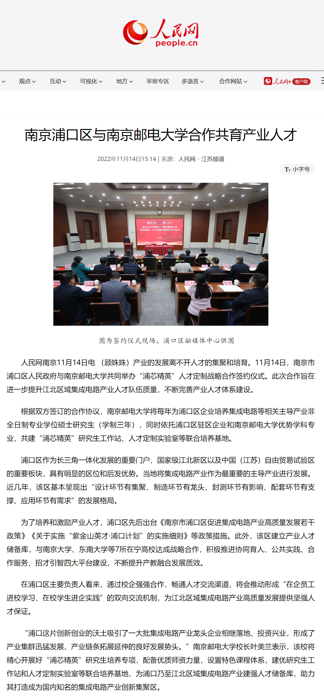 【人民網】南京浦口區與南京郵電大學合作共育產業人才