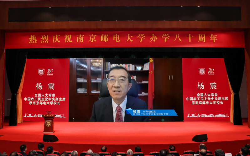全國(guó)人大常委、農(nóng)工民主黨中央副主席、我校杰出校友楊震作為校友代表,通過(guò)視頻為母校獻(xiàn)上誠(chéng)摯祝福。他深情回憶了自己在南郵學(xué)習(xí)、工作和生活的40年,表達(dá)了對(duì)母校的感恩與思念之情,他表示今天的南郵昂首進(jìn)入國(guó)家雙一流行列,已經(jīng)成為國(guó)家在信息通信領(lǐng)域人才培養(yǎng)的搖籃,科技創(chuàng)新的重鎮(zhèn),社會(huì)服務(wù)的高地,文化傳播的圣地,全體南郵人為母校感到自豪。他指出當(dāng)今的信息社會(huì)給南郵和南郵人的發(fā)展提供了十分廣闊的舞臺(tái),他希望南郵培養(yǎng)出世界一流人才,創(chuàng)造出世界一流科技成果。
