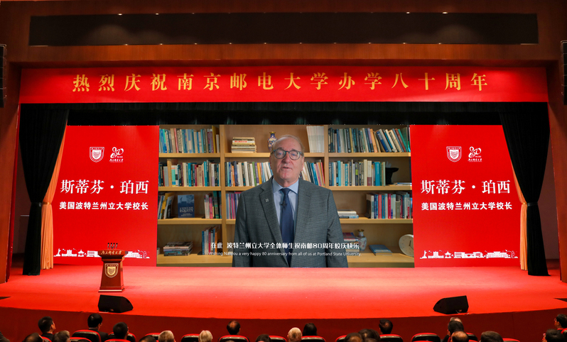 海外高校代表、美國(guó)波特蘭州立大學(xué)校長(zhǎng)斯蒂芬?珀西通過(guò)視頻致辭,向南京郵電大學(xué)表達(dá)了熱烈的生日祝賀。他介紹波特蘭州立大學(xué)與南京郵電大學(xué)共建的波特蘭學(xué)院目前教學(xué)規(guī)模已達(dá)到500多人,期待波特蘭州立大學(xué)的校園能夠在2023年迎來(lái)南郵師生開(kāi)展科研合作和教育項(xiàng)目研討,并希望未來(lái)能與學(xué)校建立更多合作項(xiàng)目。