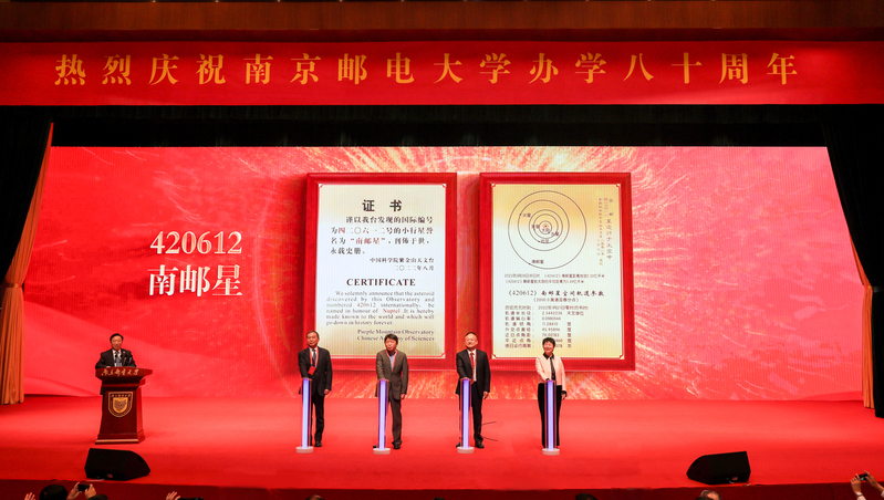 大會(huì)上,中國(guó)科學(xué)院院士史生才先生、省教育廳副廳長(zhǎng)楊樹(shù)兵先生、中國(guó)科學(xué)院南京分院院長(zhǎng)楊桂山先生和我校葉美蘭校長(zhǎng)共同為“南郵星”揭幕?!澳相]星”是南京郵電大學(xué)在辦學(xué)80周年之際,收到的一份來(lái)自太空的特殊禮物,它是由南京紫金山天文臺(tái)發(fā)現(xiàn)的一顆永久編號(hào)為420612的小行星。紫金山天文臺(tái)副臺(tái)長(zhǎng)吳雪峰表示,南京郵電大學(xué)為國(guó)家培育了一大批郵電通訊等領(lǐng)域的人才,被譽(yù)為“華夏IT英才的搖籃”,值此八十華誕之際,以一顆小行星為之譽(yù)名,體現(xiàn)了國(guó)際社會(huì)對(duì)南京郵電大學(xué)治學(xué)成就的高度褒揚(yáng)。
