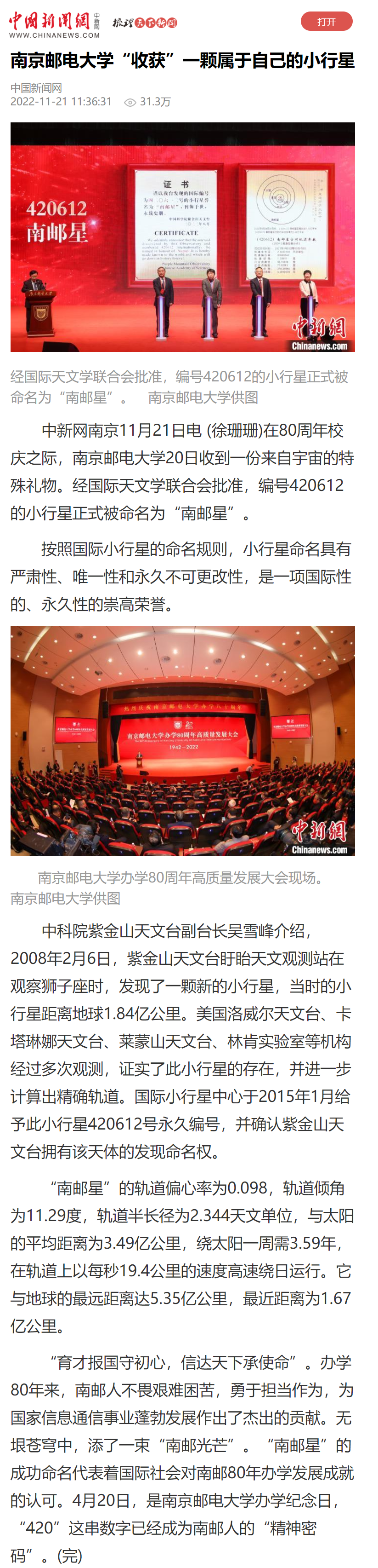 【中國新聞網】南京郵電大學“收獲”一顆屬于自己的小行星