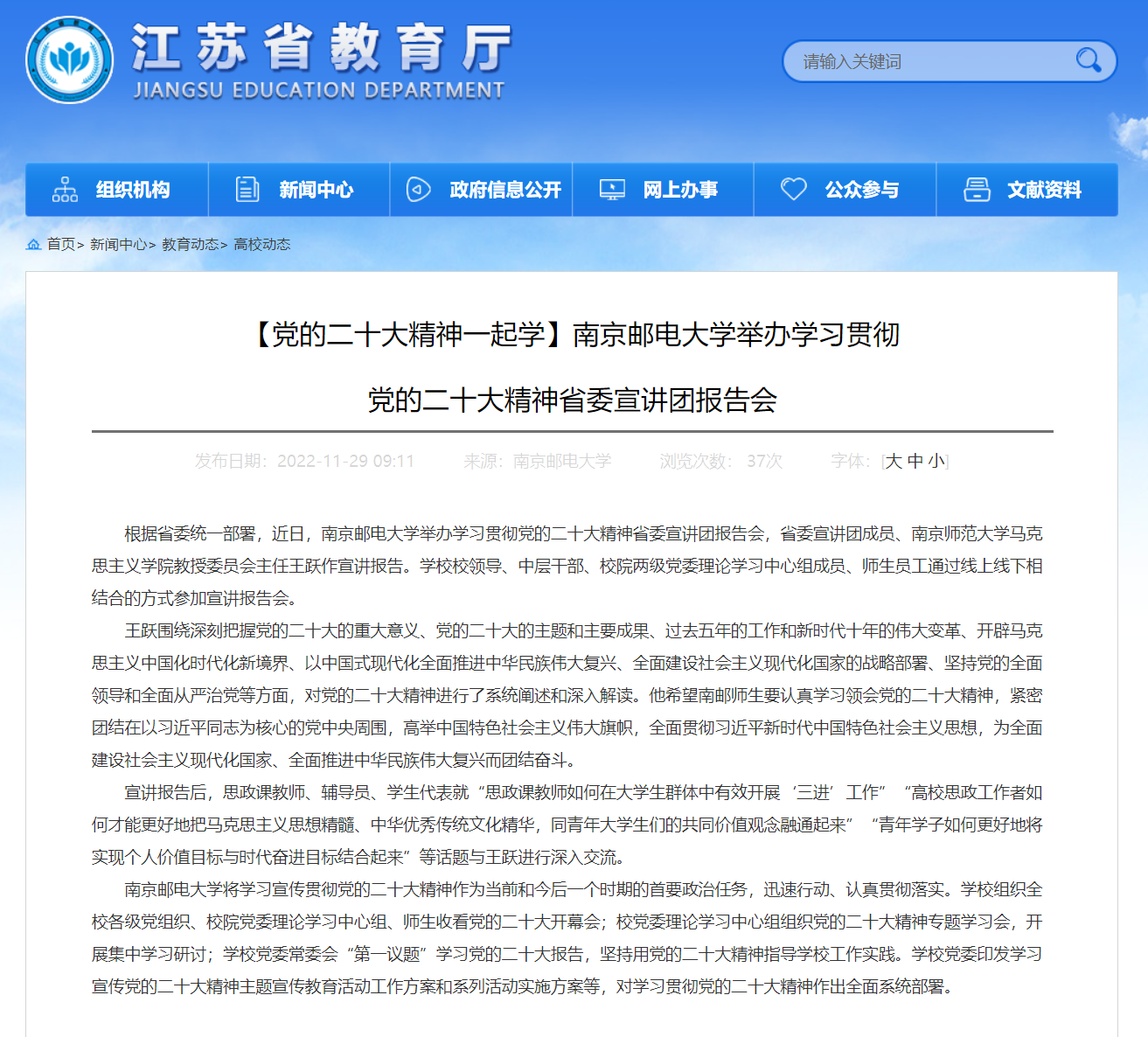 【省教育廳官網】南京郵電大學舉辦學習貫徹黨的二十大精神省委宣講團報告會