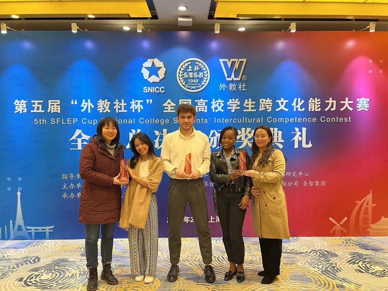 本屆大賽由中國教育國際交流協會指導、上海外國語大學主辦、上海外語教育出版社承辦,吸引全國近500所高校學生團隊參賽,40支國內學生隊伍和4支國際學生隊伍歷經校賽和省賽選拔,晉級全國決賽。在指導教師王競雄、劉涓涓和吳小海的精心指導下,我校3名國際學生在決賽中呈現的跨文化交際案例《愛在中國》獲得現場評委一致好評。該案例具有真實性和原創性,展現了“文明因交流而多彩,因互鑒而豐富”的主題。