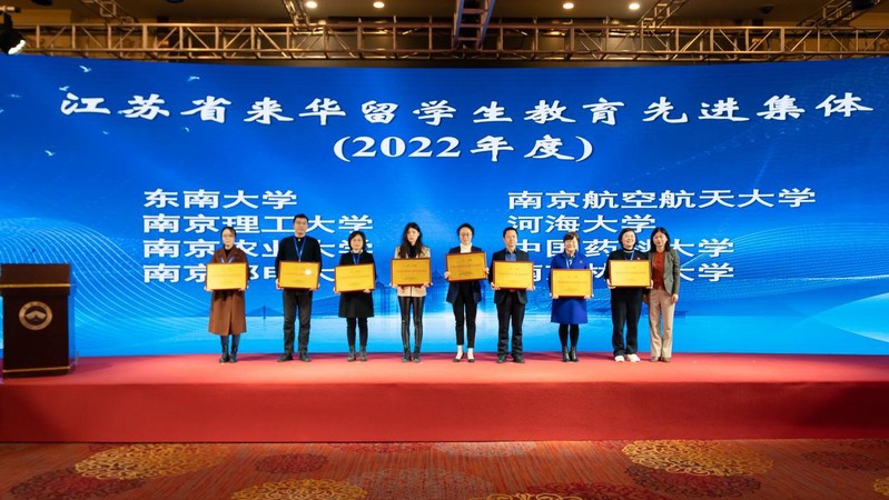 我校榮獲2022年度“江蘇省來華留學(xué)生教育先進(jìn)集體”榮譽(yù)稱號(右三)