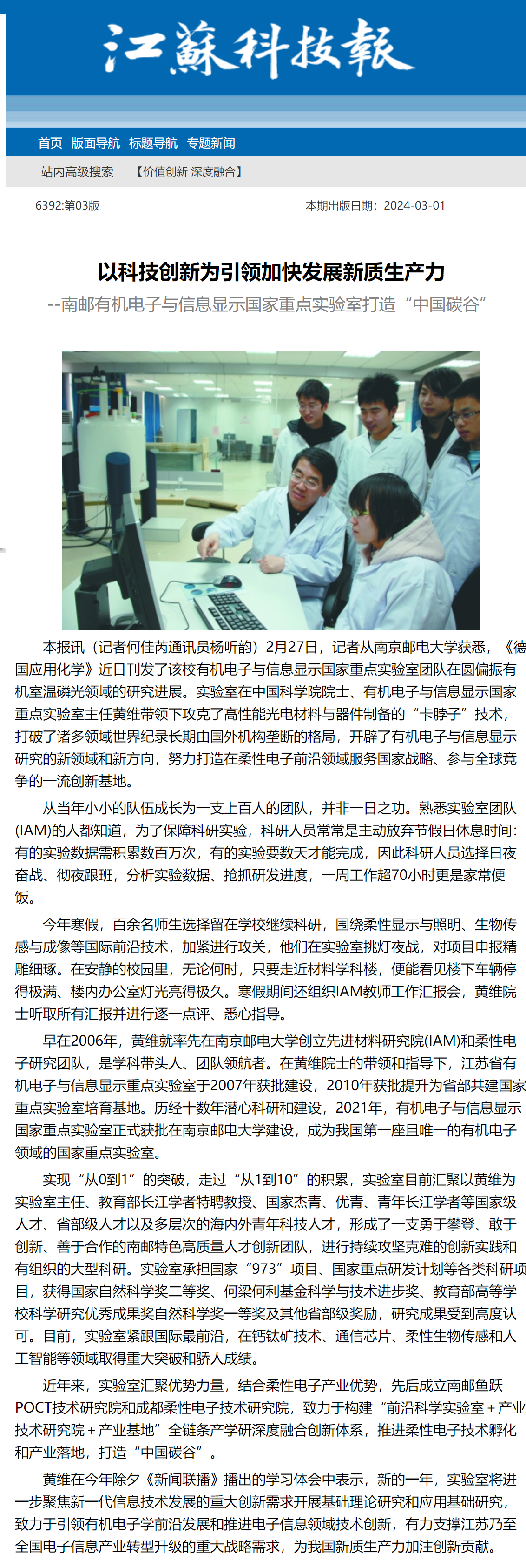 【江蘇科技報】以科技創新為引領 加快發展新質生產力——南郵有機電子與信息顯示國家重點實驗室打造“中國碳谷”