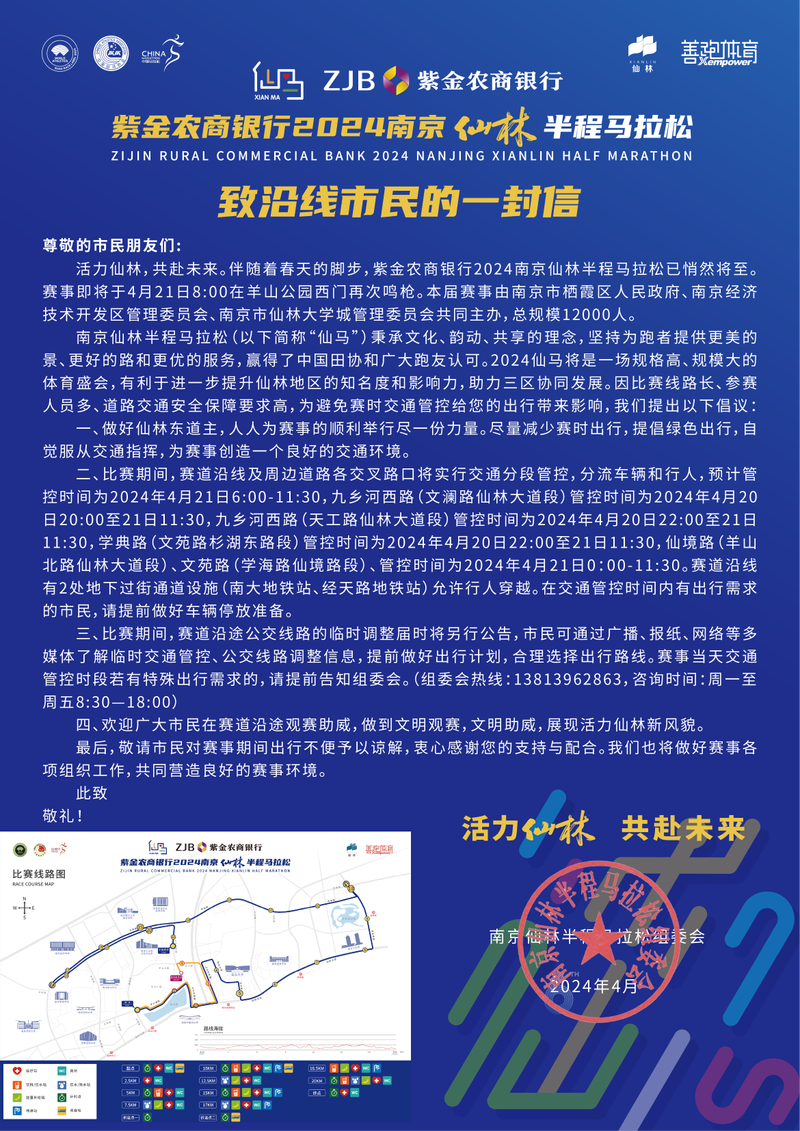 2024年4月21日8:00,“紫金農(nóng)商銀行2024南京仙林半程馬拉松”將在羊山公園西門(mén)鳴槍開(kāi)跑,總規(guī)模約12000人。為了保障賽事各項(xiàng)活動(dòng)順利開(kāi)展,組委會(huì)將對(duì)賽事起終點(diǎn)周邊道路及賽道沿線道路采取交通管控措施,詳情請(qǐng)參見(jiàn)《致駐沿線市民的一封信》。