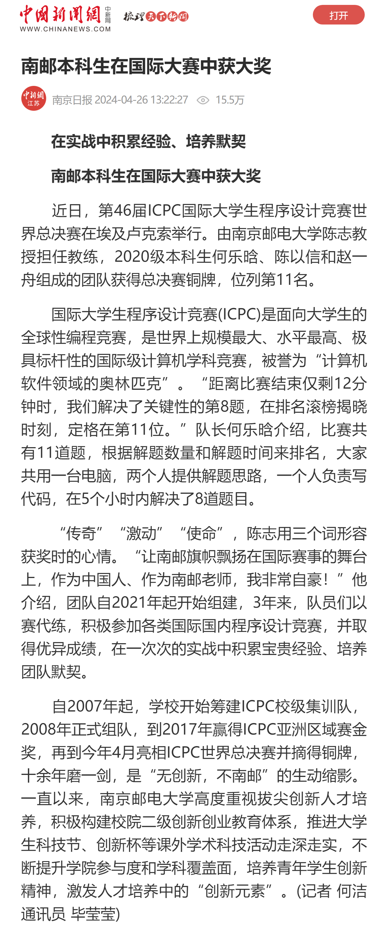 【中國新聞網】南郵本科生在國際大賽中獲大獎