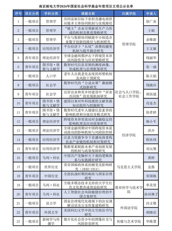 學校將認真貫徹落實習近平總書記在全國教育大會上關于科教興國戰略的講話精神,以及南郵第四次黨代會報告目標任務,全面總結2024年度項目申報經驗,不斷優化完善社科基金項目管理服務體系,協同推進文科振興計劃,積極探索信息文科發展新路徑,形成文科高質量發展的增長點,為打造多學科協調發展的一流學科建設體系、建設電子信息領域特色鮮明的世界一流大學貢獻社科科研力量。