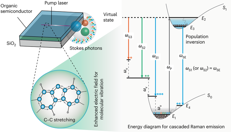 有機半導體因其獨特的分子結構和光電特性,被視為下一代柔性電子技術的核心材料,在柔性顯示、柔性光伏等領域廣泛應用。然而,其非線性光學效應需依賴極高能量激發,導致材料易被強光損傷,長期制約其在非線性光學領域的應用。拉曼散射是一種基于分子振動產生光學增益的非線性光學技術,因其特有的分子振動特征信號和靈活的光譜可調諧性,在爆炸物檢測、生物成像、光通訊等領域具有重要應用。傳統拉曼激射技術依賴高能量泵浦光源以克服分子振動損耗,導致設備繁雜、成本高昂。如何實現“低閾值、高增益”的拉曼激射,一直是全球科學家面臨的難題。