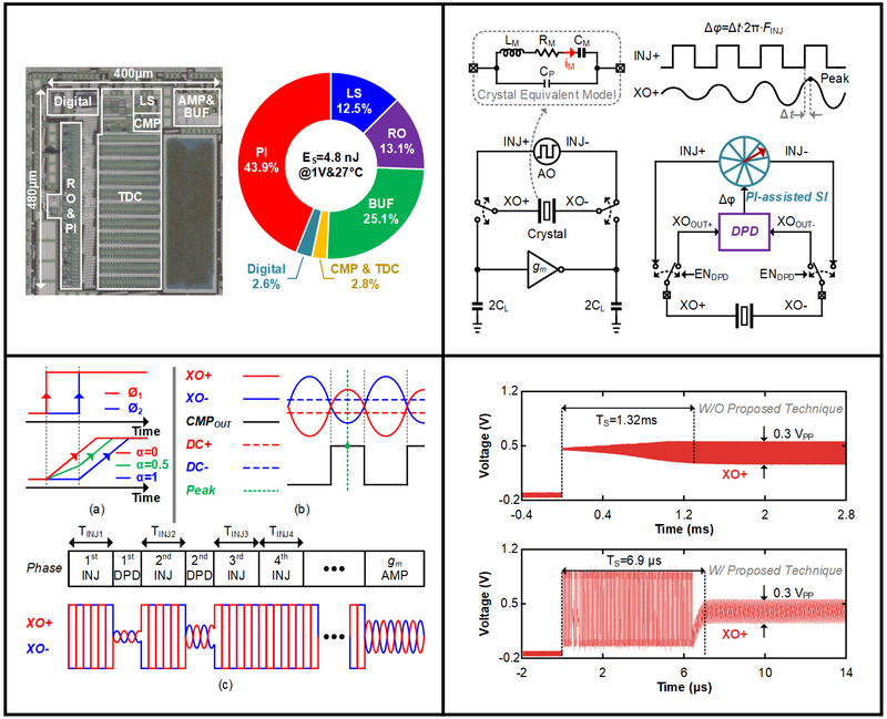 6月8日至12日,南郵郭宇鋒教授團隊在第45屆VLSI工藝與電路研討會(45th Symposium on VLSI Technology and Circuits,VLSI 2025)發(fā)表創(chuàng)新研究成果,實現了南京郵電大學在該頂級國際會議上的首次突破。該成果題為A 24-MHz Crystal Oscillator with 6.9-μs Startup Time and 2% Injection-ΔF Tolerance Using Phase-Interpolator-Assisted Synchronized Injection,由集成電路科學與工程學院博士研究生王鑫擔任第一作者,王子軒教授、蔡志匡教授、麥沛然教授共同擔任通訊作者。研究聚焦于物聯網設備中時鐘系統(tǒng)啟動緩慢的行業(yè)痛點,創(chuàng)新性提出基于相位插值器的同步注入技術。通過高效相位同步的注入機制,該技術顯著縮短了時鐘源的啟動時間,為解決時鐘系統(tǒng)啟動延遲問題提供了全新思路。研究團隊采用40納米工藝完成芯片流片驗證,測試數據顯示:時鐘源啟動時間從傳統(tǒng)技術的1.32毫秒大幅縮減至6.9微秒,優(yōu)化效果達191.3倍;同時實現±2%的超大注入頻率偏差容限,充分驗證了該技術的高性能與高可靠性。這一成果為物聯網設備的高效運行提供了關鍵技術支撐,具有顯著的應用價值。