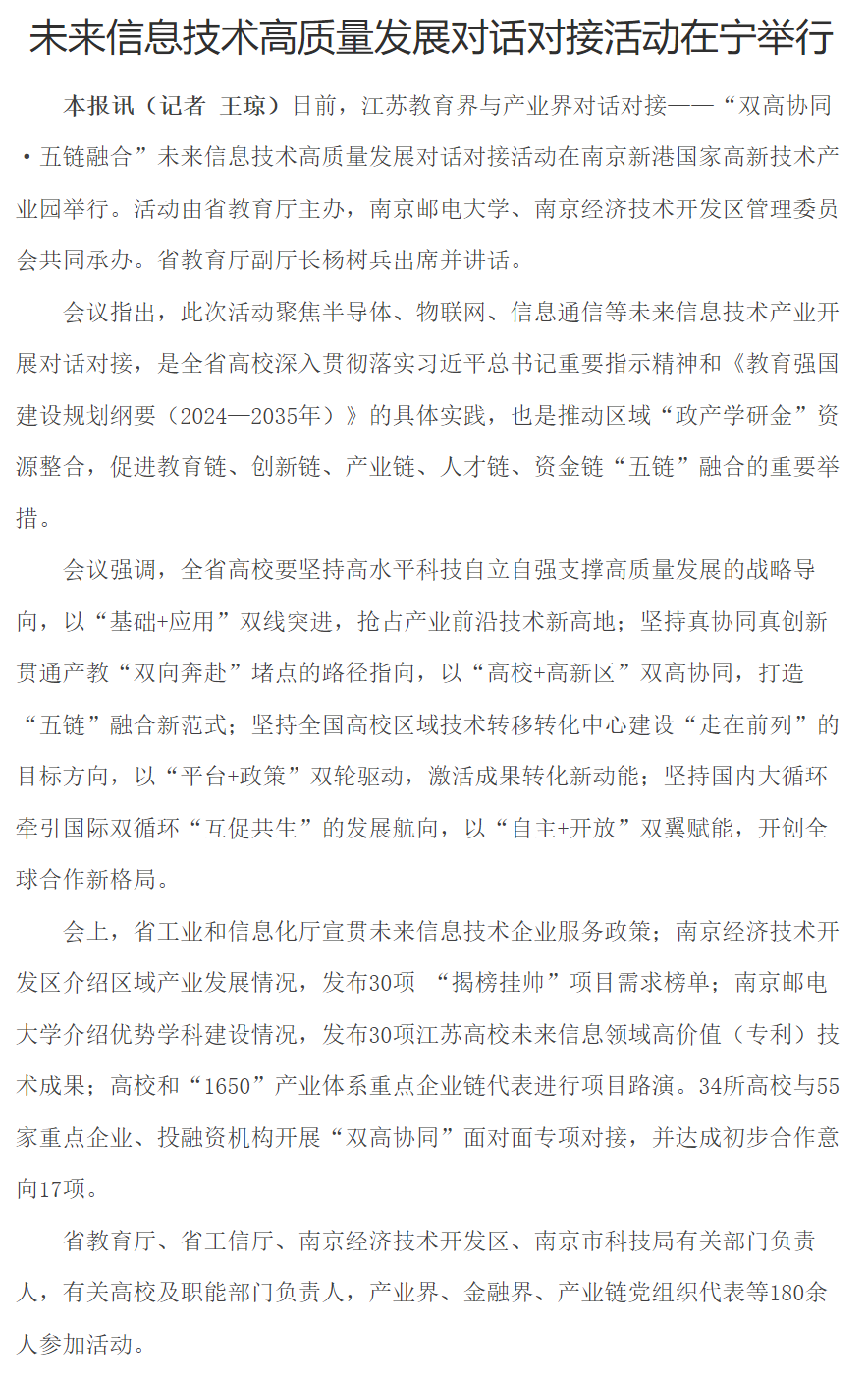 【江蘇教育報(bào)】未來信息技術(shù)高質(zhì)量發(fā)展對話對接活動在寧舉行