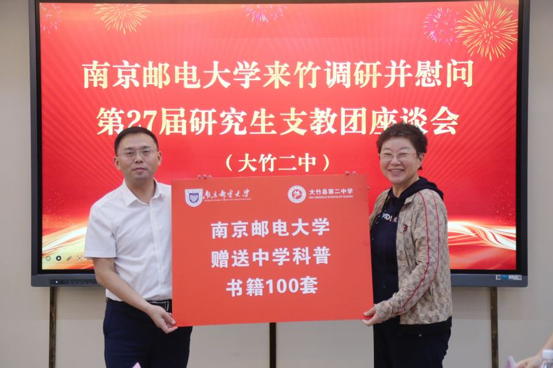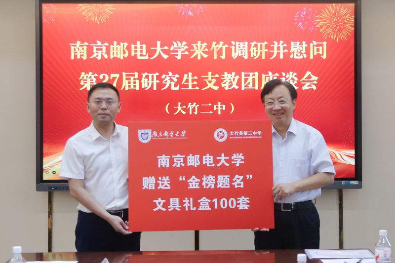 調研座談會上,南郵向大竹二中贈送中學科普讀物100套、“金榜題名”文具禮盒100套,用于支持學生學習成長,傳遞南郵師生對竹鄉(xiāng)教育事業(yè)的持續(xù)關懷。