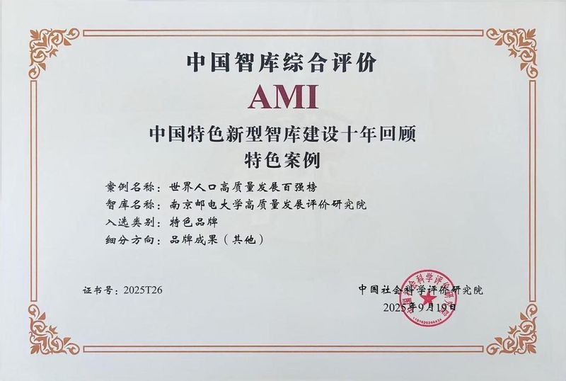 9月19日,第八屆中國智庫建設與評價高峰論壇在北京召開,會上公布了中國智庫綜合評價研究項目(2025)評審結果,南京郵電大學高質量發展評價研究院入選“2025年AMI智庫入庫單位”,“世界人口高質量發展百強榜”獲評“中國特色新型智庫建設十年回顧特色案例”。