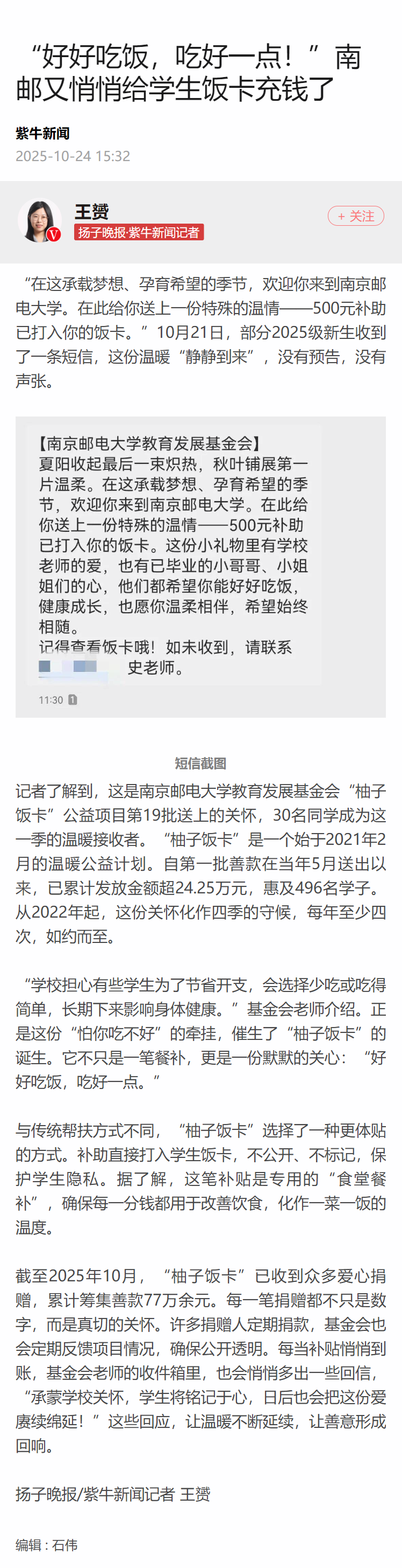 【揚子晚報客戶端】“好好吃飯,吃好一點!”南郵又悄悄給學生飯卡充錢了