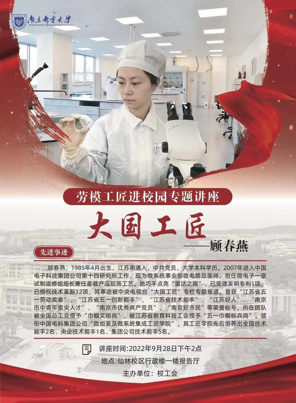 為堅持以習近平新時代中國特色社會主義思想為指導,大力弘揚勞模精神、勞動精神、工匠精神,引導廣大師生樹立正確的人生觀、成才觀、勞動觀,9月28日(周三)下午2:00,校工會在仙林校區行政北樓一樓報告廳舉行“勞模工匠進校園”專題報告會,邀請“大國工匠”——十四所微系統事業部微電路總裝師顧春燕作專題講座。屆時,報告會將進行線上同步直播。