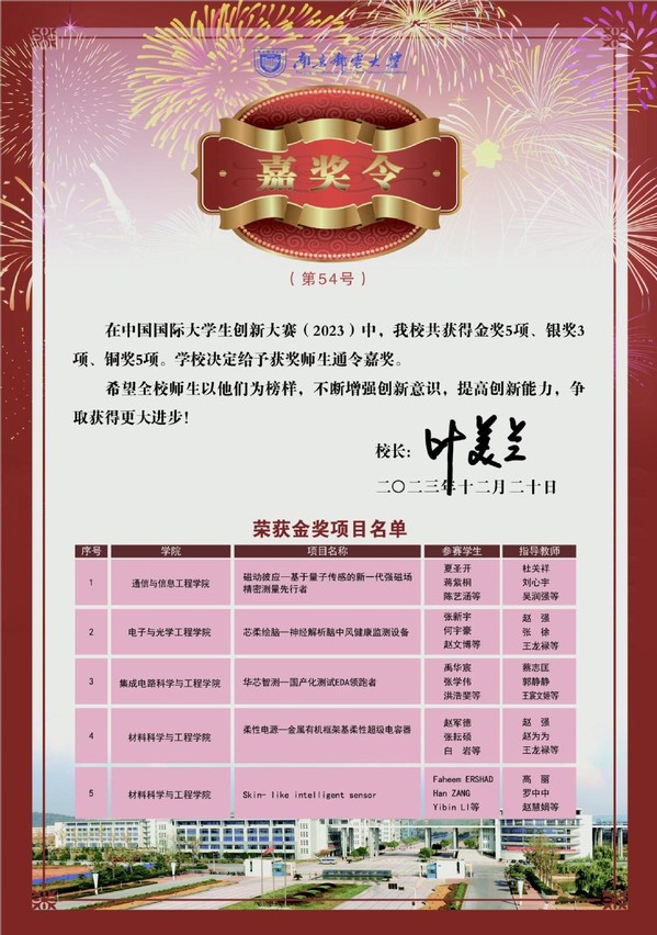 近日,葉美蘭校長簽發嘉獎令,表彰我校在中國國際大學生創新大賽(2023)、第十八屆“挑戰杯”全國大學生課外學術科技作品競賽、2023年全國大學生電子設計競賽、2023年全國大學生數學建模競賽等重要學科競賽中取得佳績的師生,希望全校師生以他們為榜樣,不斷增強創新意識,提高創新能力,爭取獲得更大進步!